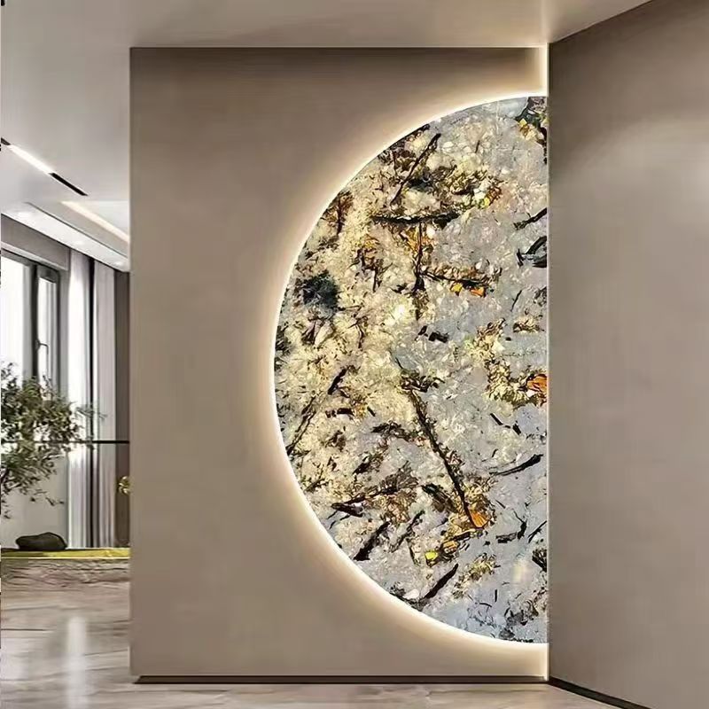 These panels are crafted by embedding LED lighting behind thin slices of onyx, marble, or engineered stone—creating a backlit surface that unveils the vein patterns and texture of the stone in radiant detail. The result is both functional lighting and sculptural art.